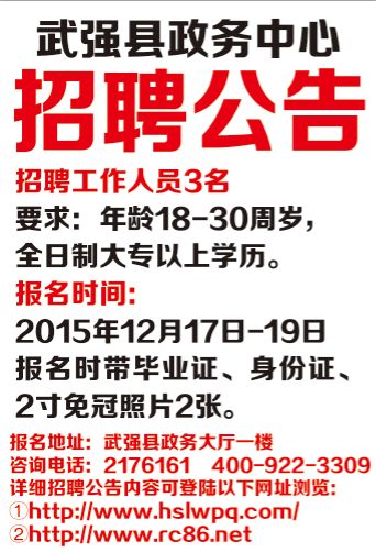 根據(jù)用工需求,現(xiàn)委托衡水天翔勞務(wù)派遣有限公司代武強(qiáng)縣政務(wù)服務(wù)中心招聘派遣用工3名。擬面向社會(huì)公開(kāi)招聘工作人員,現(xiàn)將有關(guān)事宜公告如下: