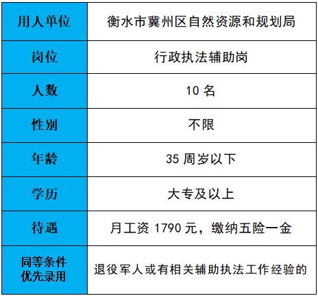 衡水天翔勞務派遣有限公司接受衡水市冀州區(qū)自然資源和規(guī)劃局的委托,結(jié)合實際用人需求,面向社會公開招聘10名行政執(zhí)法輔助人員。具體招聘事宜如下:
